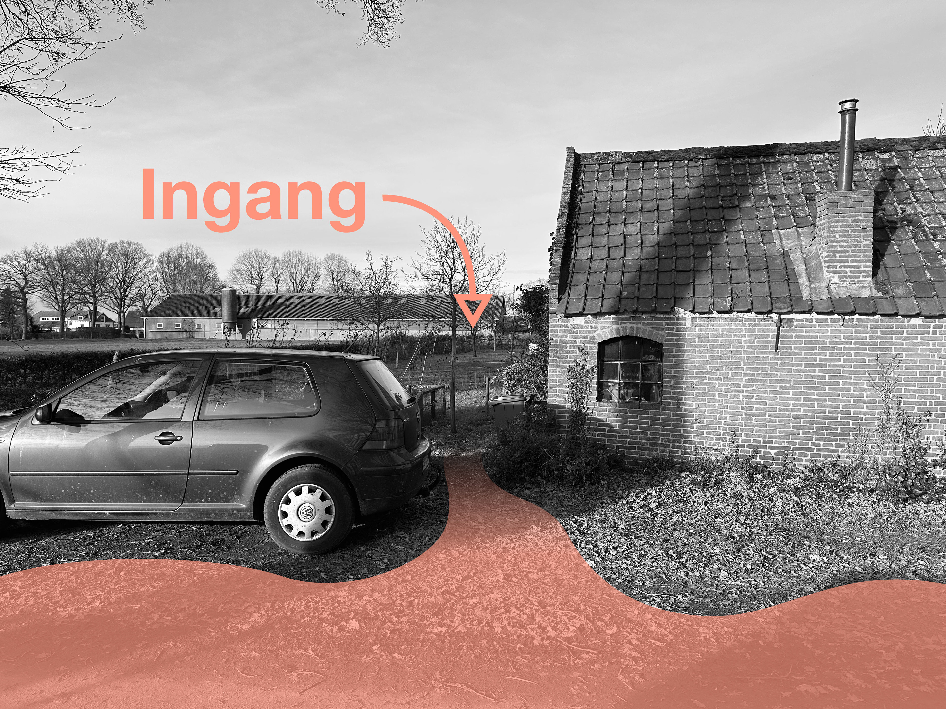 Loop links om het huisje heen om bij de voordeur te komen. Als het goed is kan je de kerstlichtjes volgen.
